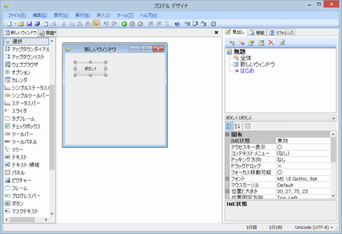 「ウィンドウの設計」画面を使って、プログラム上で表示するウィンドウをデザインすることができます。
