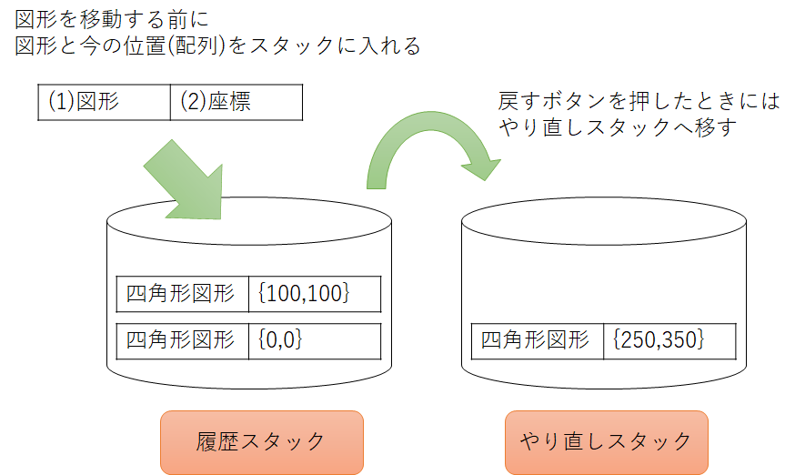 履歴スタックに{選択図形,選択図形の位置}を積む